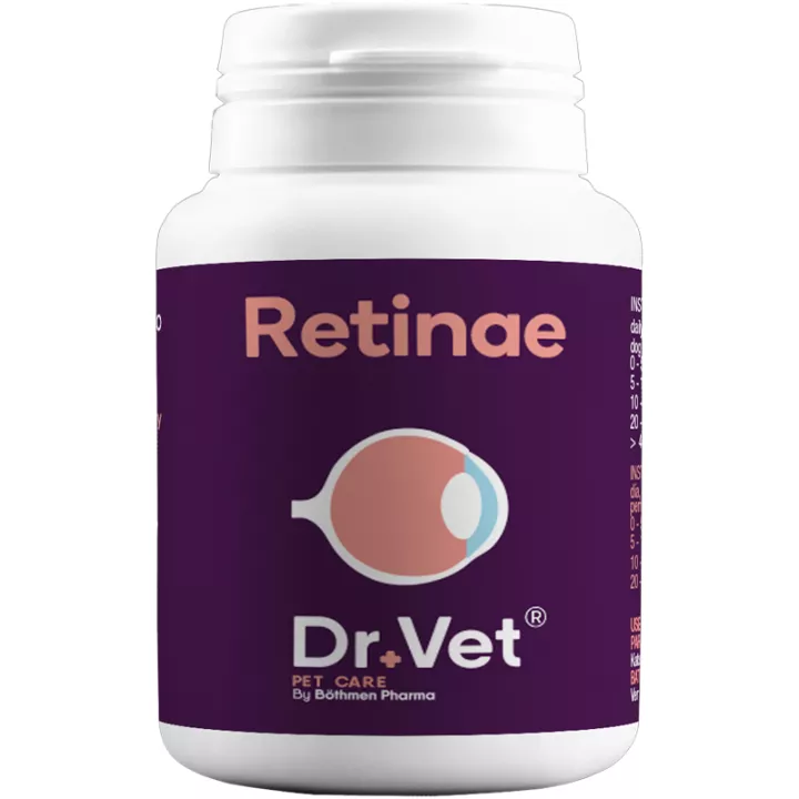 Das Ergänzungsfuttermittel für Tiere Dr. Vet Retinae ist in Form einer Flasche mit 30 Tabletten erhältlich.