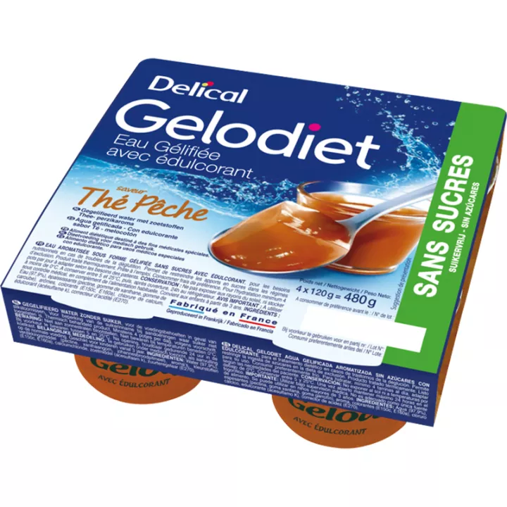 Para una dieta completa y equilibrada, combine Gelodiet Eaux Gélifiées con Delical Crème Dessert HP HC Sans Sucres 4x200g, un complemento alimenticio rico en proteínas y sin azúcar.