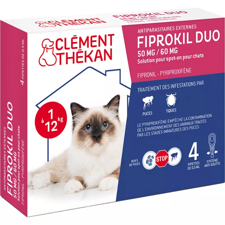Clément Thekan Fiprokil Duo Chat est une solution pour spot-on à utiliser contre les infestations par des puces seules ou les infestations mixtes par des puces et des tiques. Clément Thekan Fiprokil Duo Chat est destinée au chat de 1 à 6 kg Clément Thekan Fiprokil Duo Chat associe du fipronil et du pyriproxifène. Le pyriproxifène empêche la contamination de l'environnement des animaux traités par les stades immatures des puces.