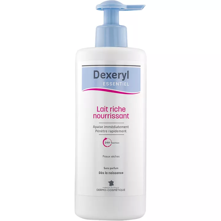 Dexeryl ESSENTIEL Leite Rico Nutritivo é uma fórmula de alta nutrição para 24 horas, num galénico fluido e aveludado. Graças à sua fórmula especialmente concebida para as peles secas ou com tendência à atopia, hidrata e nutre intensamente durante 24 horas*: a barreira cutânea é reforçada e a pele fica protegida de forma duradoura. Desde o 1º dia de utilização, as sensações de repuxamento e de irritação são atenuadas. A sua textura fluida e aveludada é rapidamente absorvida, permitindo vestir-se rapidamente sem ficar pegajosa. É fácil e rápido de aplicar todos os dias para uma pele suave e bonita.